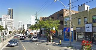 Emerging from the lovely back streets and joined a roaring main street, Eglinton Avenue. Up ahead, I saw a man, a homeless person, sitting on a blanket on the sidewalk with two dogs. Absolutely beautiful dogs. I stopped, told him so. The dogs, perfectly friendly, came over to me for a pat.